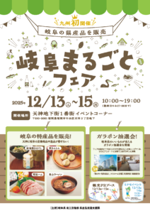 ■詳細情報 催事名:~岐阜まるごとフェア~ 会期:2025年12月13~15日 10時~19時 場所:天神地下街1番街 (福岡市中央区)